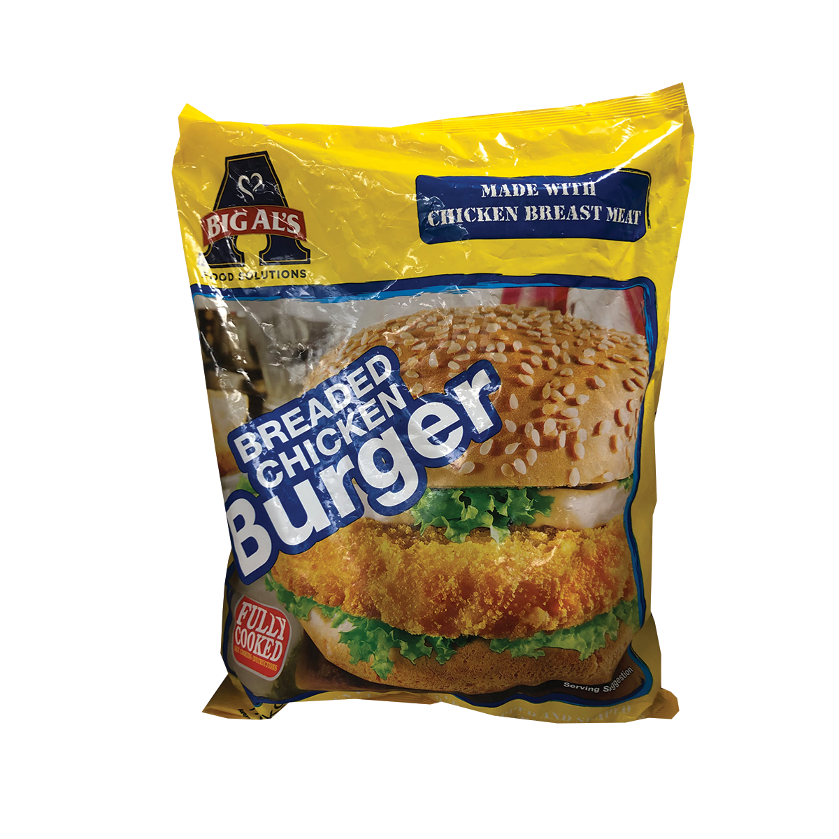 Big Al's Breaded Chicken Burgers Frozen 1.9KG. Big Al's Breaded Burgers Made with 100% whole chicken breast Free from artificial colour, flavours and preservatives. Halal