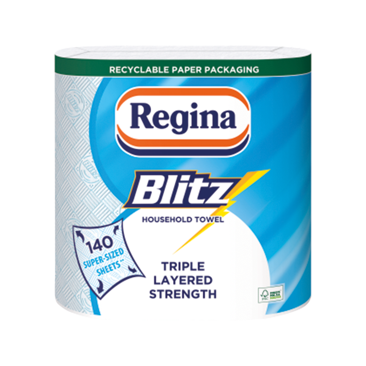 The multi - tasking household towel, all wrapped up in 100 % recyclable paper packaging. With 60 % larger than standard kitchen roll sheets, Regina Blitz is perfect for even the toughest jobs around the home.