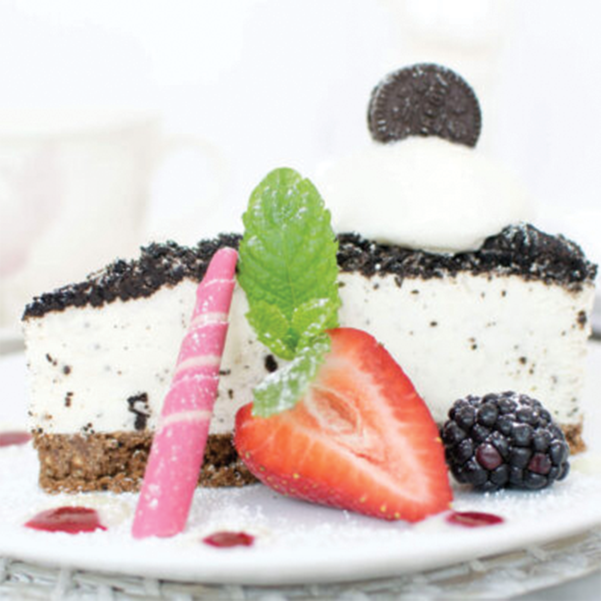 Indulgent creamy vanilla set cheesecake blended with chunks of chocolate sandwich cookie topped with chocolatey biscuit shards.