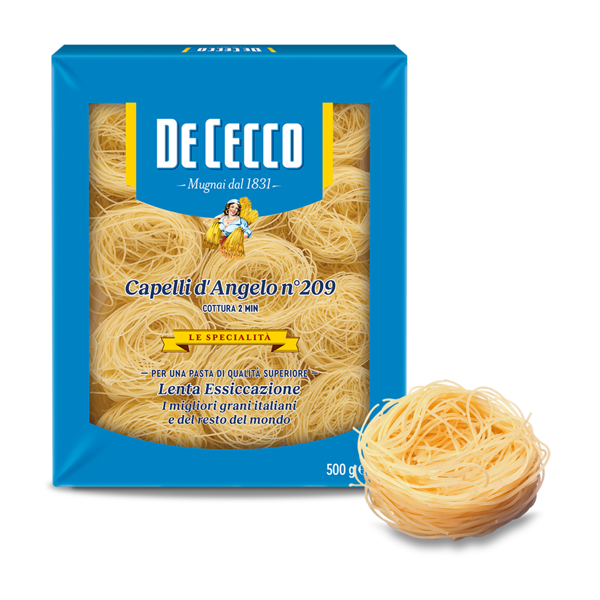 The origins of Capelli d'Angelo, with their evocative name (Angel Hair) and light consistency, are contested between the area around Genoa, Naples and the Ciociaria (central Italy). It is one of the thinnest types of long pasta wound into a nest shape. Even the name Capelli d'Angelo is reminiscent of the fine consistency of this type of pasta which is ideal for infants from 9 months old onwards to help them get used to eating food for grown-ups.