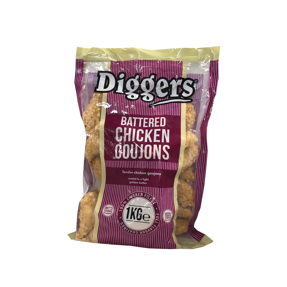 Diggers Battered Chicken Goujons 1Kg. Tender marinated chicken breast goujons coated in a light golden batter. High in Protein-100% made with breast fillet-Halal.