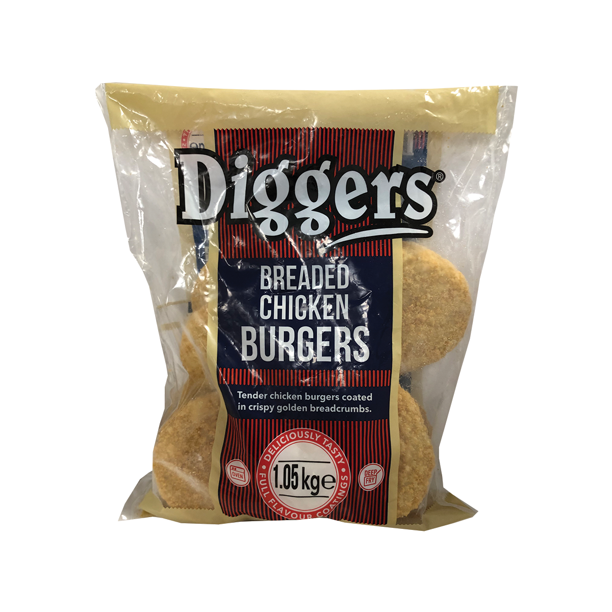 Diggers Breaded Chicken Burgers 1.05Kg. Chicken Meat Burgers with added water, formed, breaded, pre-fried, cooked and deep frozen. High in Protein-100% made with breast fillet-Halal.