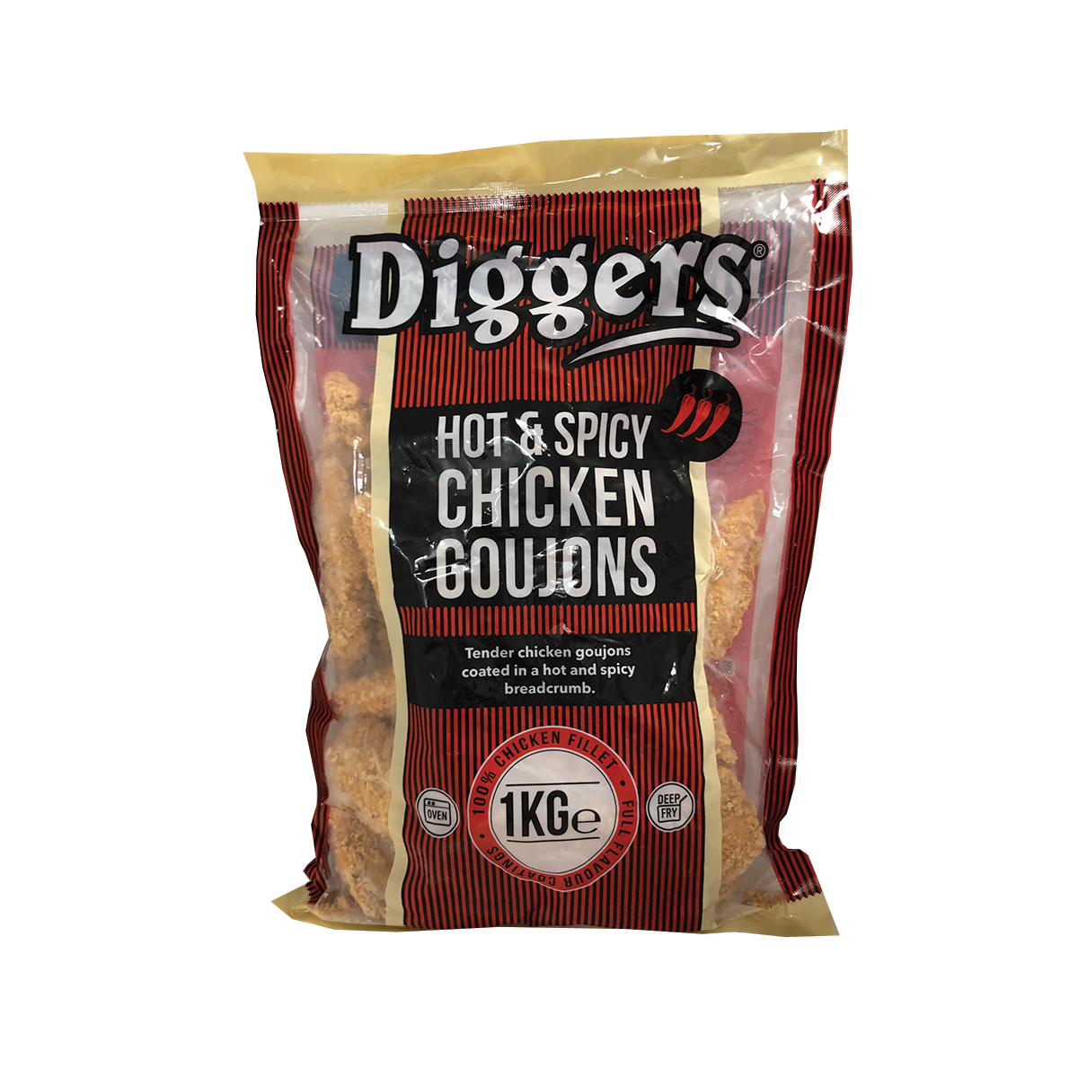 Diggers Hot and Spicy Chicken Goujons 1kg. Deliciously tender chicken goujons coated in a crispy golden hot and spicy breadcrumb. High in Protein-100% made with breast fillet-Halal.