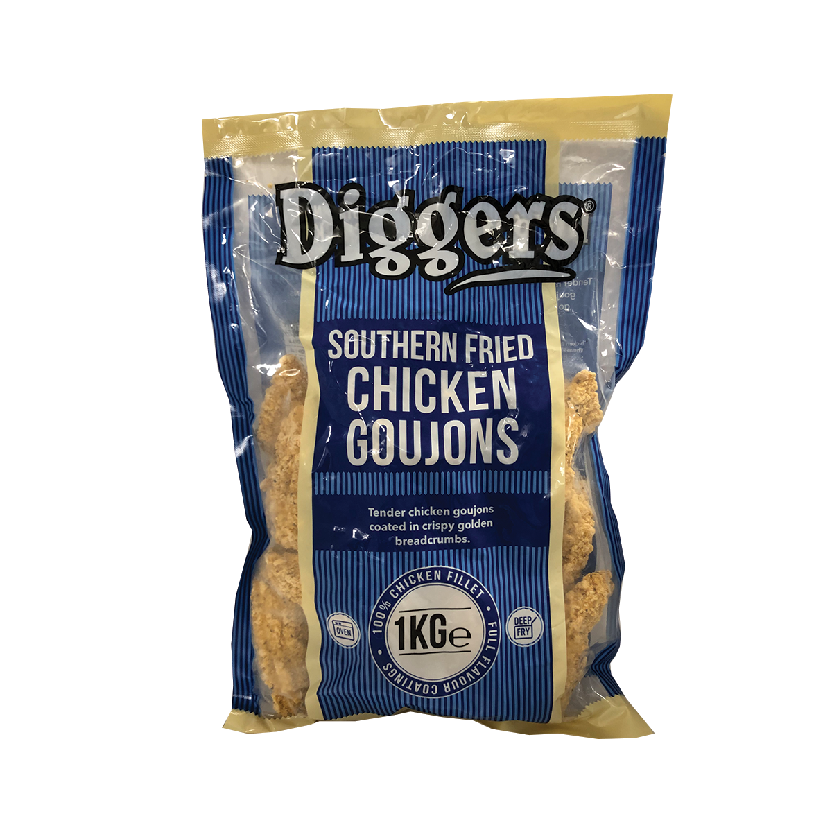 Diggers Southern Fried Chicken Goujons 1Kg Deliciously tender chicken goujons coated in a crispy golden southern fried breadcrumb.
