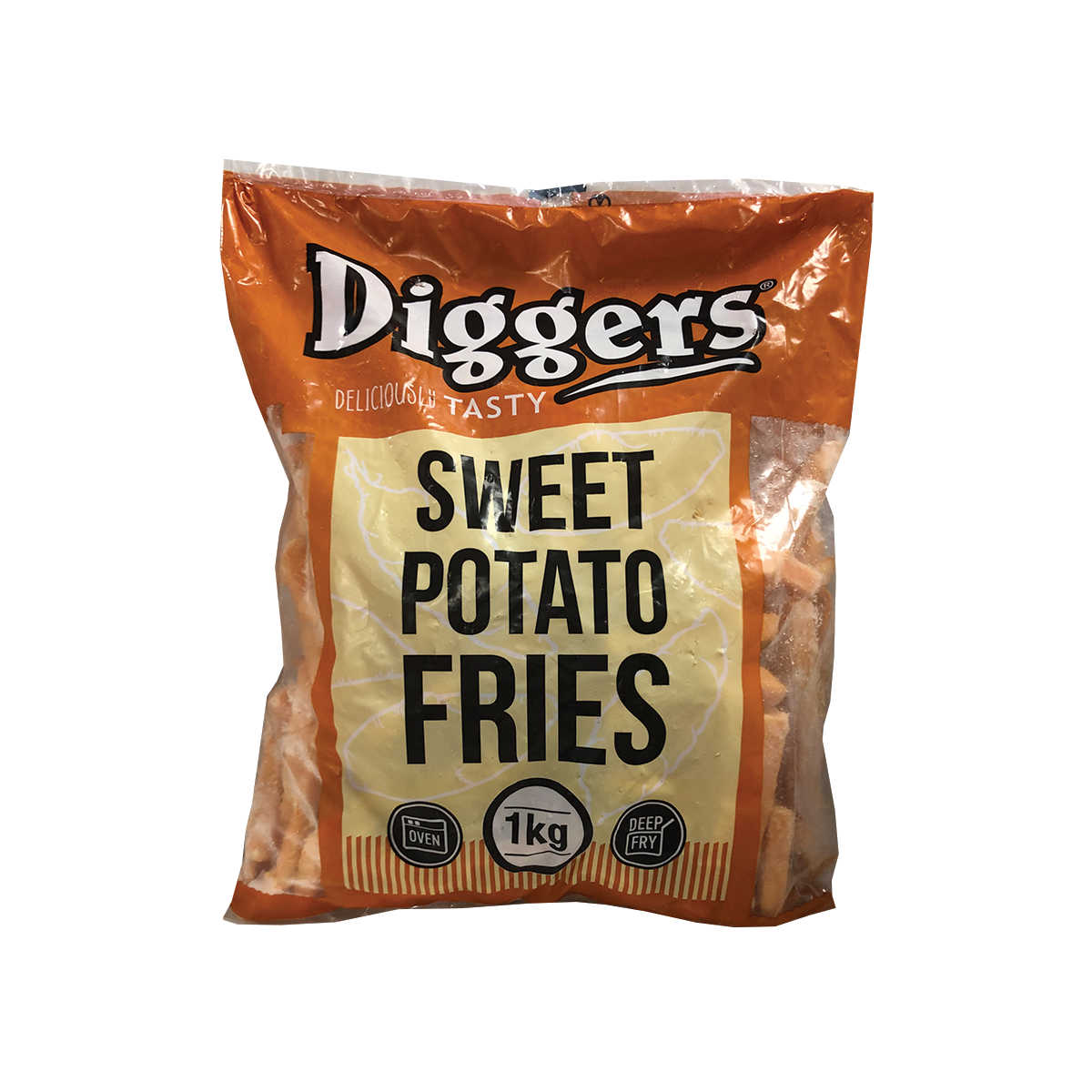 Diggers Sweet Potato Fries 1kg. Frozen, Battered, Sweet Potato Fries.