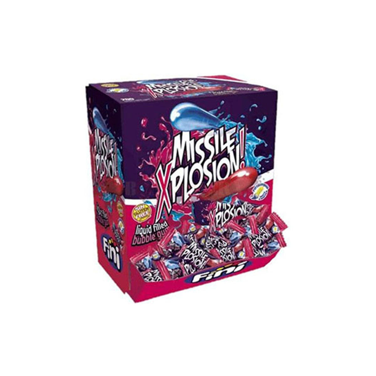 FINI Liquid Filled Bubblegum 200p. Fini Missile Xplosion Bubblegum is sour flavour bubblegum with a liquid centre in the shape of a missile, even more fun, it paints your tongue as you chew!