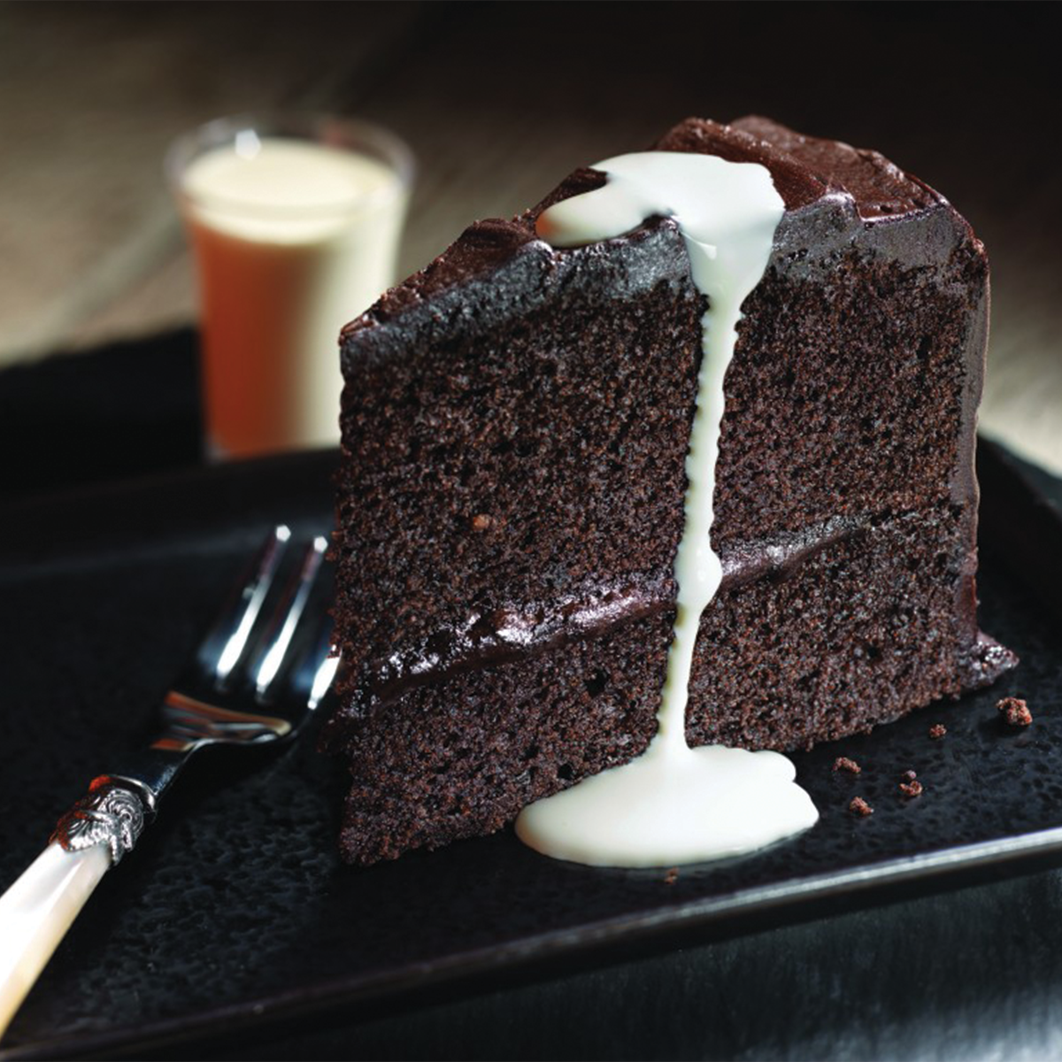 A round chocolate sponge filled, top and side coated with chocolate fudge. This gateau is pre-portioned into 14 portions.