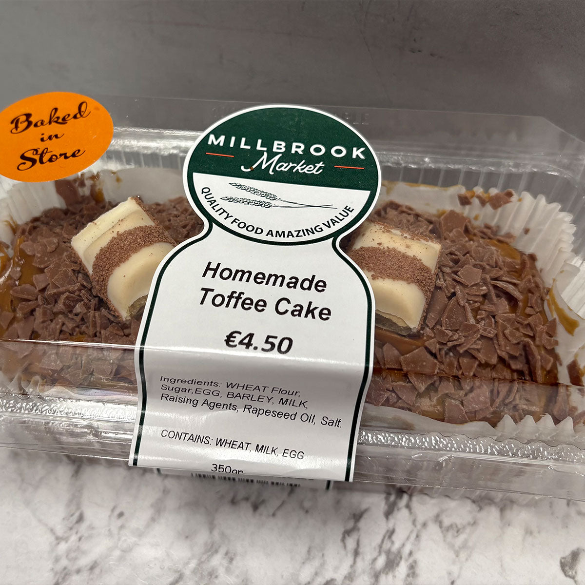 Ingredients: WHEAT Flour (WHEAT), EGG, BARLEY, MILK, Sugar, Sunflower Oil, Salt, Baking Soda, Toffee Pieces.