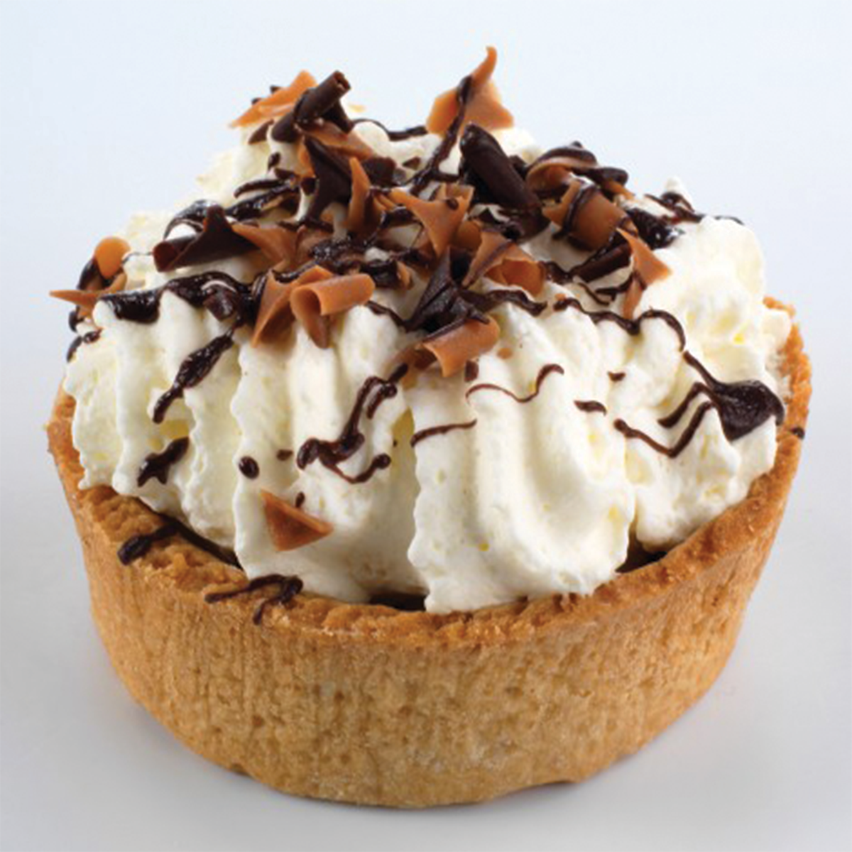 Ingredients: Banoffi Pie Base (Flour (WHEAT Flour, Raising Agents: E450, E500), Caster Sugar, Vegetable Margarine (Palm Oil, Sunflower Oil, Water, Salt, Emulsifier: Polyglycerol Esters of Fatty Acids, Flavourings, Colour: Curcumin), Water, Digestive Biscuit Crumb [Fortified Wheat Flour (WHEAT Flour, Calcium Carbonate, Iron, Nicotinic Acid, Thiamin), Sunflower Oil, Palm Oil, Rapeseed Oil, Sugar, Wholemeal WHEAT Flour, Raising Agents: Sodium Bicarbonate, Ammonium Bicarbonate, Tartaric Acid, Disodium Diphosphate, Malic Acid; Partially Inverted Sugar Syrup, Salt, Dried Whey (MILK), Dried Malt Extract (BARLEY)], Toffee Sauce (29%) (Caster Sugar, Condensed Milk (Sugar, Milk Solids, Butterfat (Milk), Golden Syrup, Unsalted Butter (Water, MILK Fat, Curd (MILK)), Caramel (Glucose Syrup, Sweetened Condensed MILK, Water, Unsalted Butter (MILK), Palm Oil Emulsifiers: E322, E491; Flavouring (MILK, SOYA)), , Whipped Cream (Fresh Cream (MILK), Sweetened Cream (Water, Partially Hydrogenated Palm Kernel Oil, Sugar, Stabilizers: E420, E460, E466; Emulsifiers: E472b, E471, Soya Lecithin; MILK Protein, Salt, Flavour, Acidity Regulators: E340, E331, Colour: Beta-Carotene), Banana (14.5%), Caramel Curls (Sugar, Cocoa Butter, Whey Powder (MILK), Whole Milk Powder, Lactose (Milk), Emulsifier: SOYA Lecithin, Natural Vanilla Flavouring, Butter Oil (MILK), Natural Flavouring, Colour: Capsanthin)), Dark Chocolate Curls (Cocoa Mass, Sugar, Cocoa Butter, Butter Oil (MILK), SOYA Lecithin, Natural Vanilla Flavouring), , Chocolate Coating (Sugar, Hydrogenated Vegetable Fat, Fat-Reduced Cocoa Powder, Whey Powder (MILK), Emulsifiers: E322 (Soya), E492, E476; Flavour).