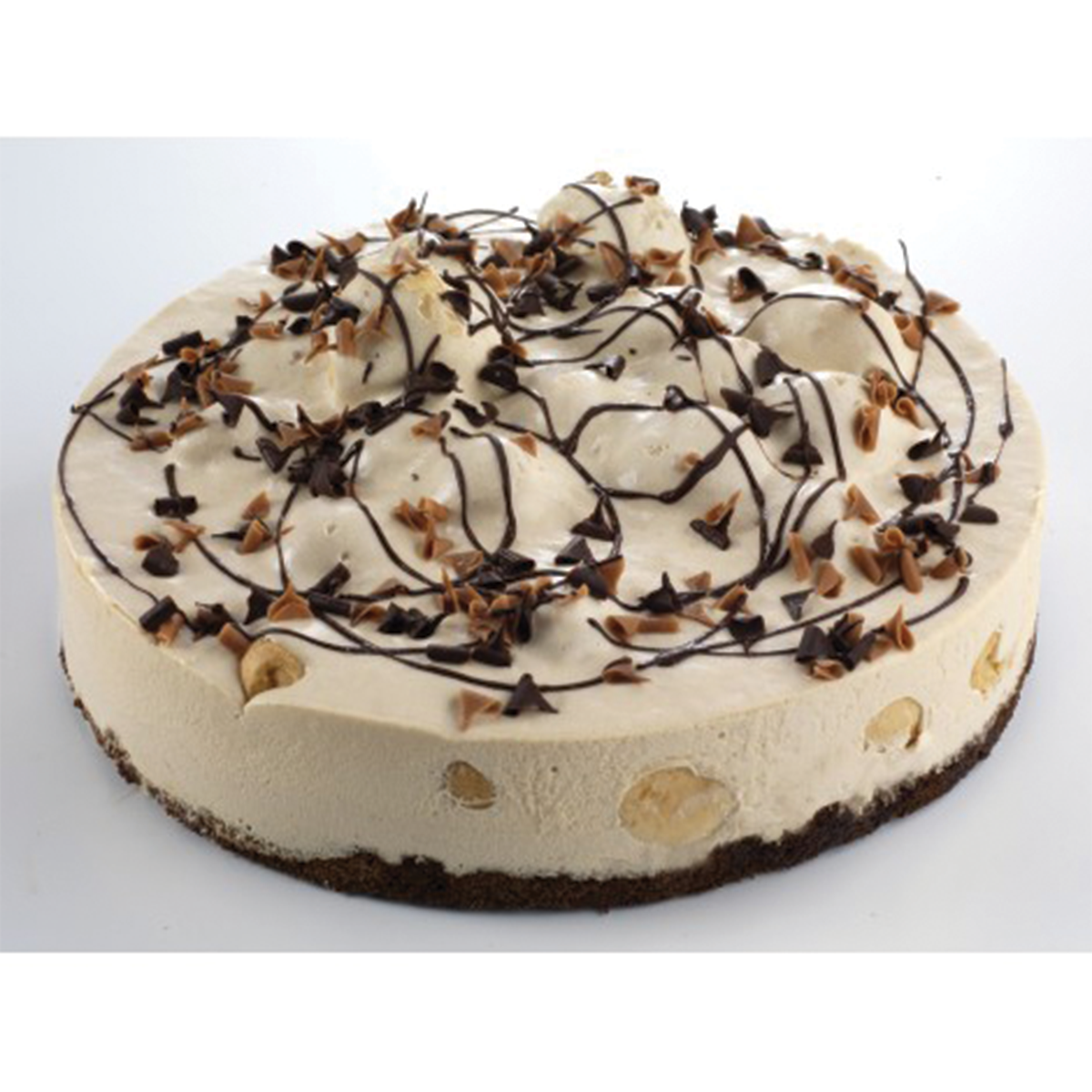 Cream filled profiteroles embedded in a light hazelnut mousse sitting on a rich chocolate sponge base. Sprinkled with crisp chocolate curls.