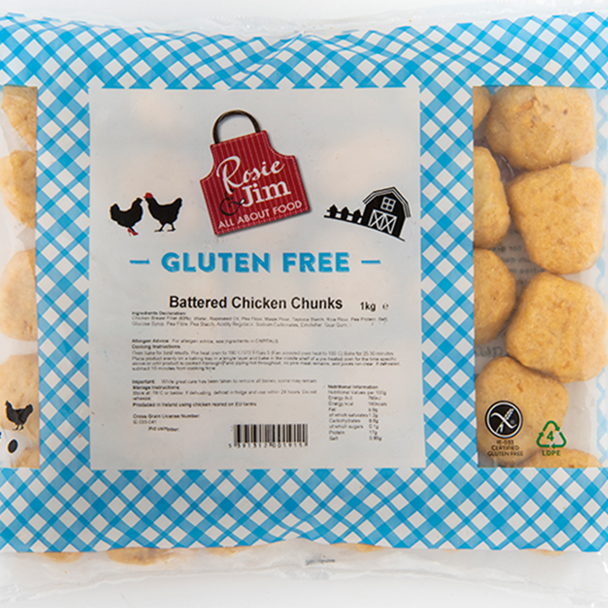 Whole fillet chunks of 100% chicken breast, in a light, golden, tempura batter coating!