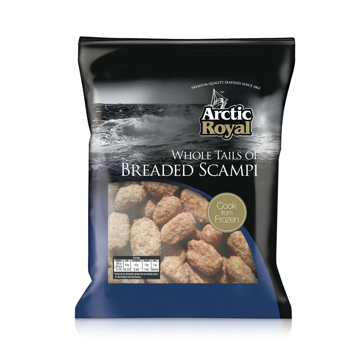 Raw frozen wholetails of Scampi with added water in a light crispy crumb.
